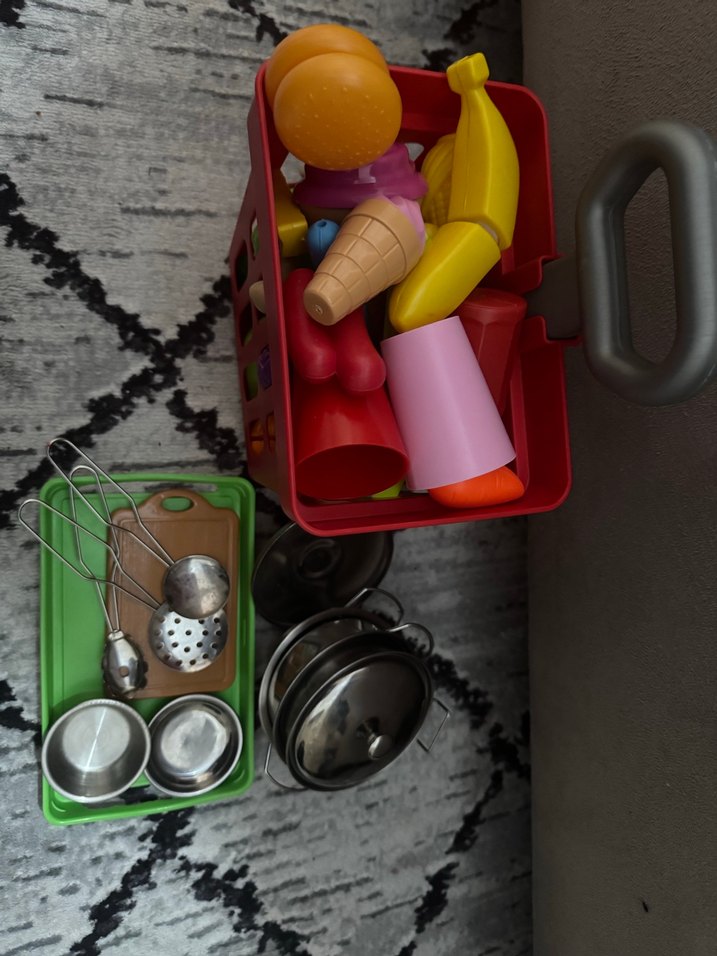 Renkli plastik mutfak gereçleri ve oyuncak yiyeceklerden oluşan set, içinde dondurma külahı ve muz bulunur.
