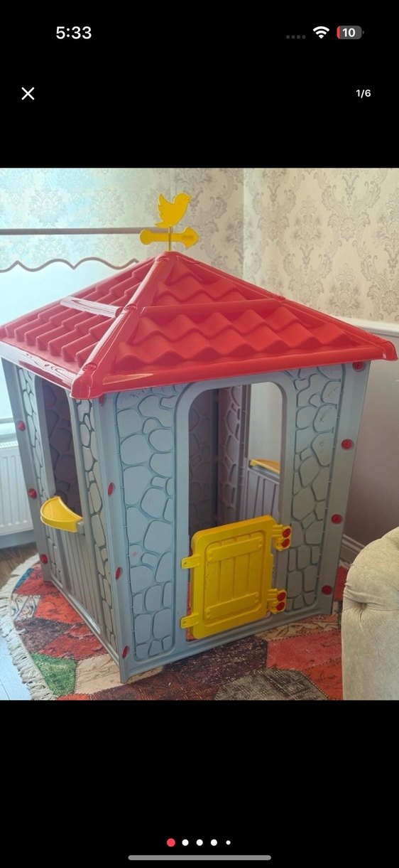 Gri gövde, kırmızı çatı ve sarı kapı ve pencere kepenklerine sahip renkli plastik oyun evi. Çocuklar için konforlu bir oyun alanı sunar. Tertemizdir