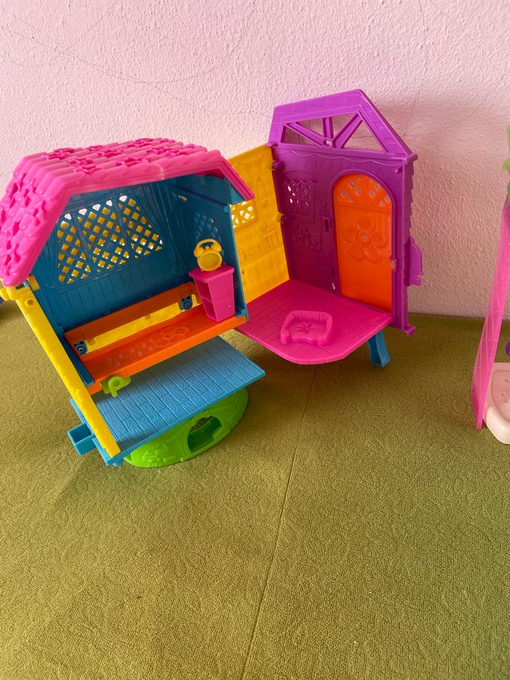 Canlı renklerde plastik oyun evi, kaydırak ve küçük bebek figürleri içeren eğlenceli oyuncak seti.