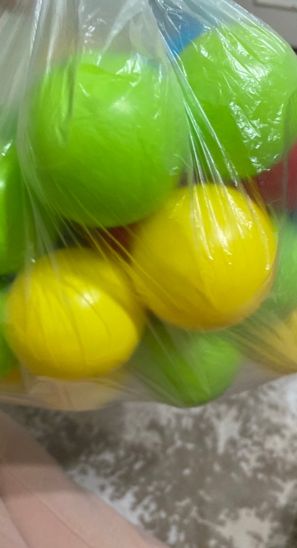 Sarı ve yeşil renklerde plastik toplar, şeffaf bir torbada paketlenmiş. Oyun zamanı için uygun.