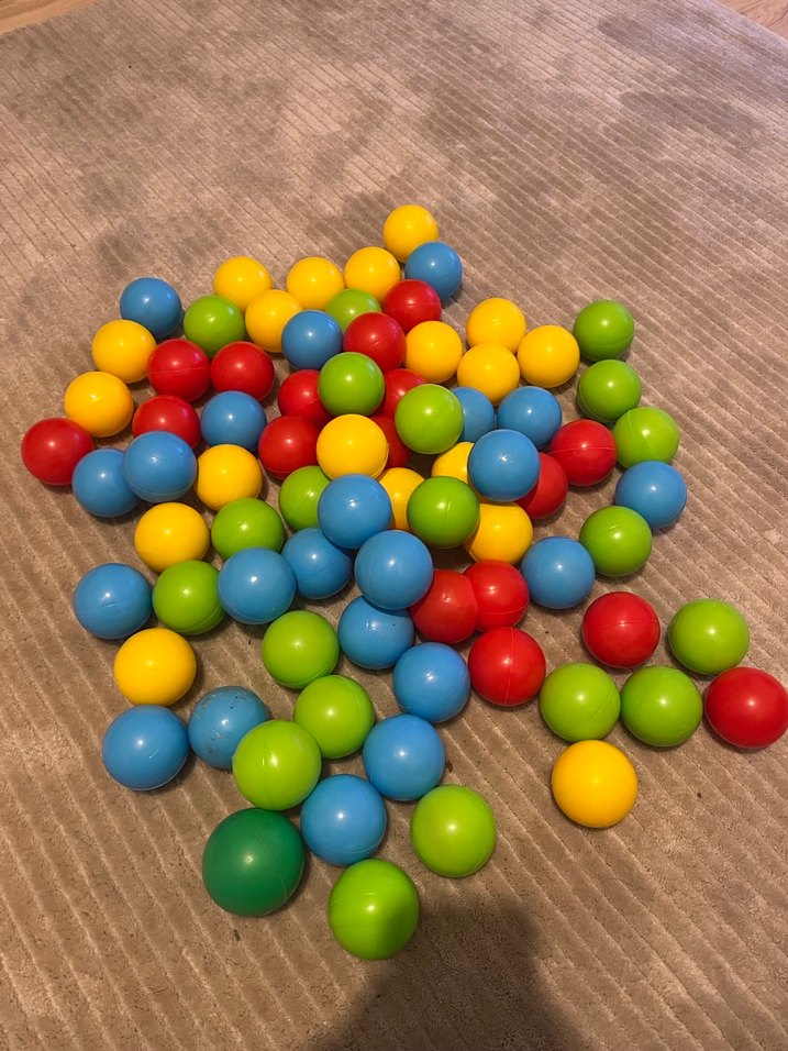 Kırmızı, mavi, sarı ve yeşil renklerde plastik oyun toplarından oluşan renkli bir set. 80 adet vardır.