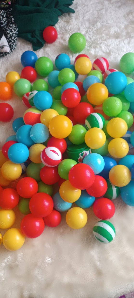 Kırmızı, mavi, yeşil, sarı ve çizgili desenlerde çeşitli renkli plastik toplar seti. Oyun ve duyusal aktiviteler için uygundur.
