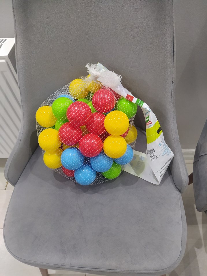 Farklı canlı renklerde plastik oyun toplarından oluşan set, file torba içinde paketlenmiştir. Oyun aktiviteleri için uygundur. hiç kullanılmamış 60adet