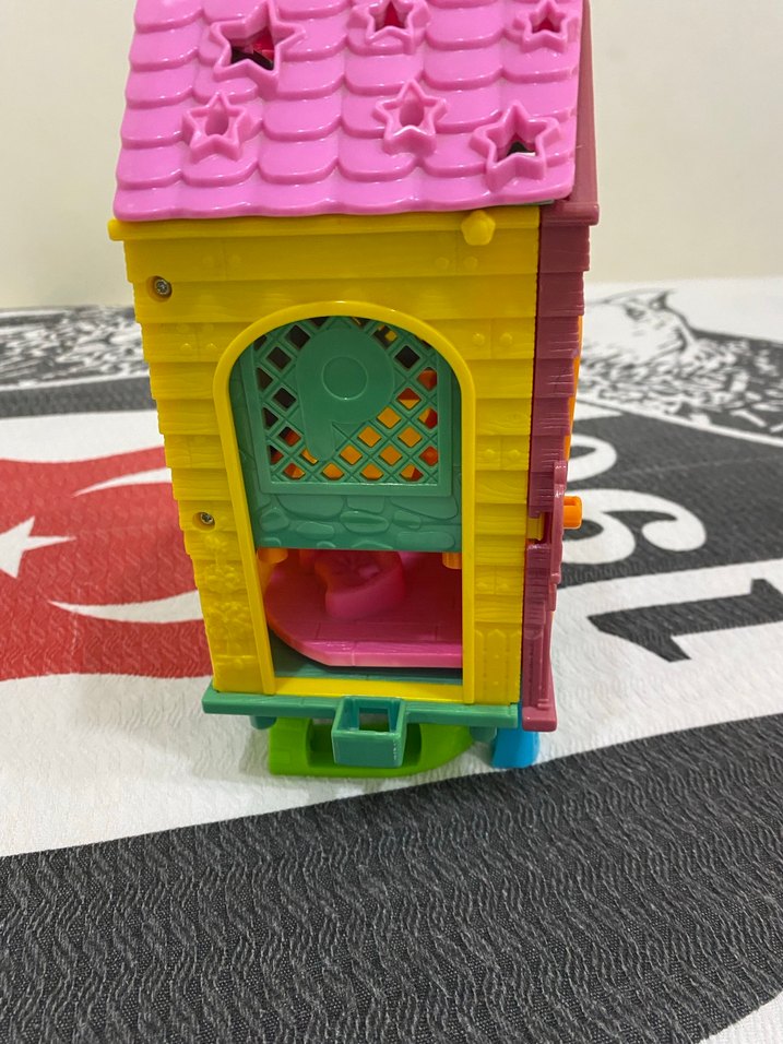 Pembe çatılı ve sarı gövdeli, yeşil pencereli renkli plastik oyuncak evdir. Canlı detaylarla etkileşimli oyun sunar.