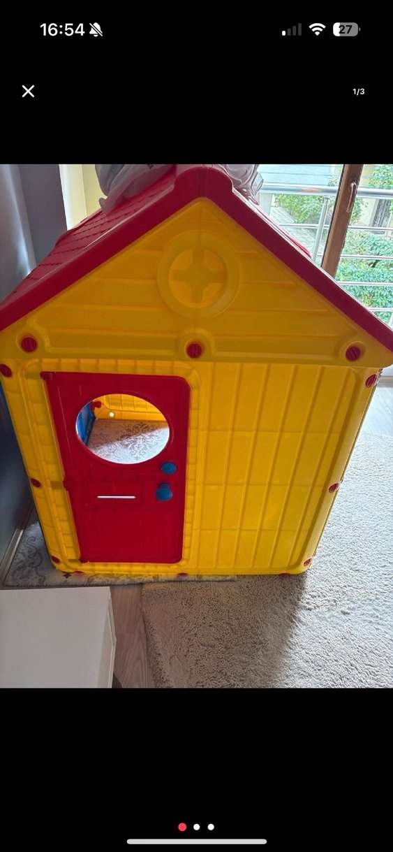 Çocuklar için kırmızı kapılı, sarı duvarlı renkli plastik oyuncak ev. Kapıda yuvarlak pencere ve sade tasarımlı çatı bulunur.
