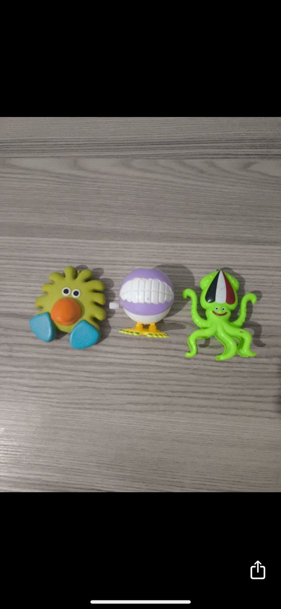 Güneş şeklinde, gülen ağız ve şapkalı ahtapot figürlerinden oluşan renkli plastik oyuncak seti. Canlı ve eğlenceli tasarım.