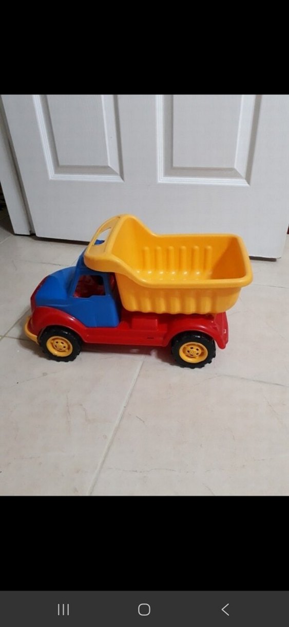 Sarı yük kasası ve kırmızı-mavi gövdesi olan renkli plastik oyuncak kamyon. Hayal gücünü destekler. 40 cm uzunluğunda