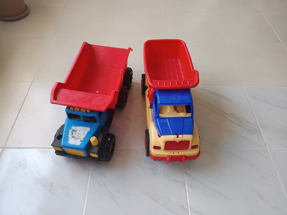 Çocuklar için tasarlanmış kırmızı kasa ve mavi-sarı kabinli iki renkli plastik oyuncak kamyon. Kasalarında kırıklar mevcuttur. Bu şekilde kullanıyor çocuklar. Bizimkiler büyüdüğü için elden çıkarıyoruz.