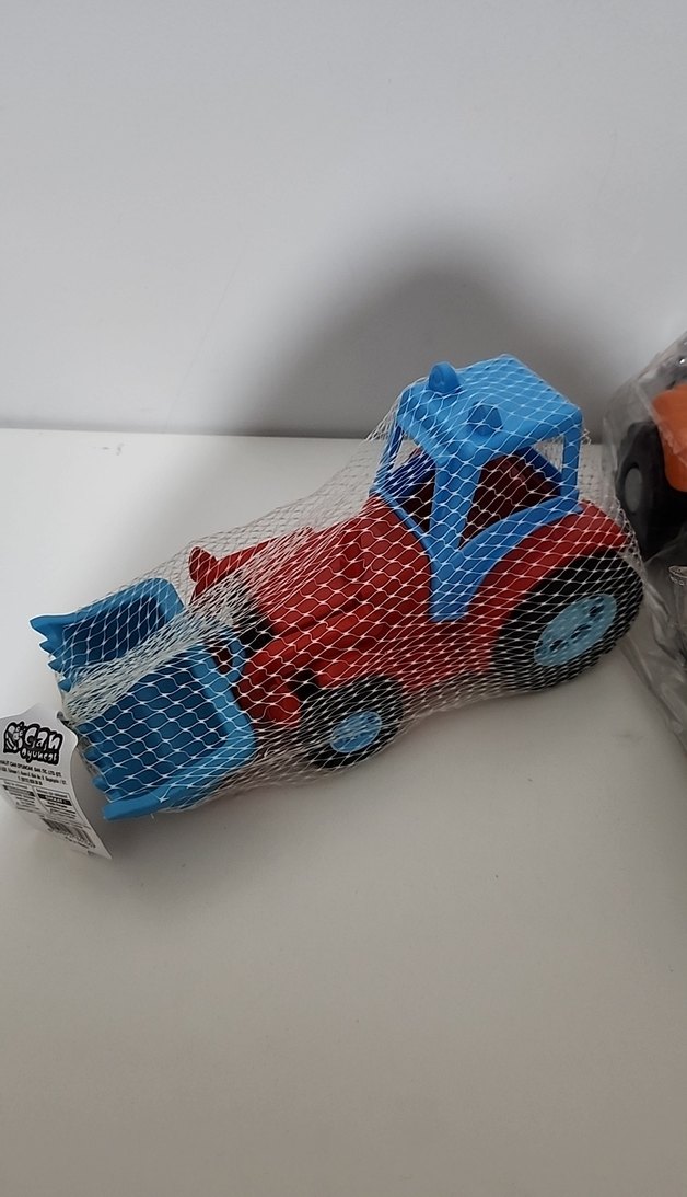 Mavi ve kırmızı renklerde, hareketli kepçeye sahip renkli oyuncak kepçe.