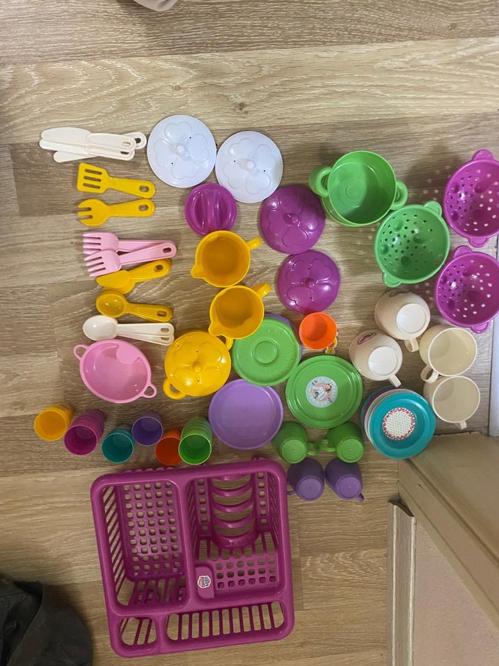 Çeşitli şekil ve boyutlarda, renkli plastik oyuncak mutfak gereçleri ve tabaklar, bardaklar, kaşıklar ve süzgeçler dahil. Toplu fiyat