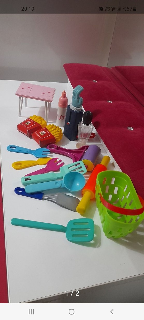 Renkli plastik oyuncak mutfak seti, çeşitli mutfak gereçleri, kaplar ve küçük bir masa içerir.