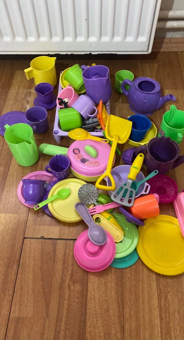 Çeşitli renklerde plastik bardaklar, tabaklar, mutfak gereçleri ve tencereler içeren renkli oyuncak mutfak seti. ️
