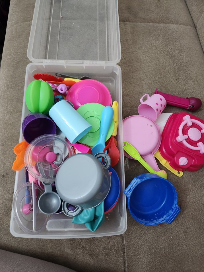 Çeşitli renklerde plastik oyuncak bardak, tabak ve mutfak gereçlerinden oluşan oyun seti. Şeffaf saklama kutusu ile birlikte.oyun hamuru yapışmış olanlar var.cikartmaya çalıştım ama tam çıkmadı.