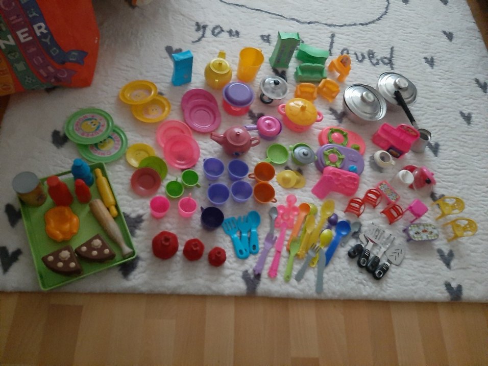 Çeşitli tabak, bardak, çatal, kaşık ve tencerelerden oluşan renkli plastik oyuncak mutfak seti. ️