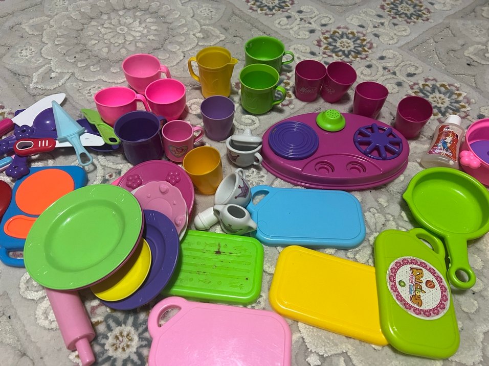 Renkli plastik oyuncak mutfak seti, bardaklar, tabaklar, tepsiler ve pişirme aksesuarları içerir. ️