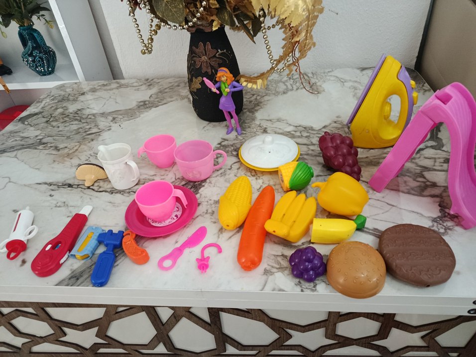 Renkli plastik oyuncak mutfak seti; bardaklar, tabaklar, çatal-kaşık ve plastik meyve sebzeler içerir.