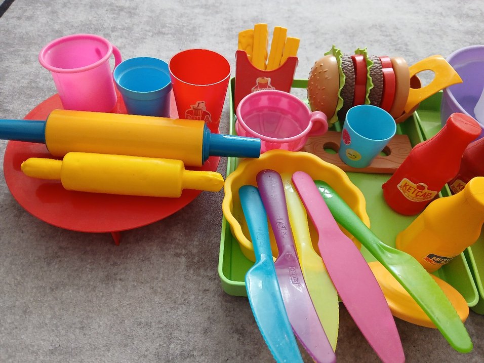 Renkli plastik oyuncak mutfak seti; bardaklar, çatal-kaşık, patates kızartması ve hamburger gibi oyun yiyecekleri içerir. hepsinin fiyatıdır
