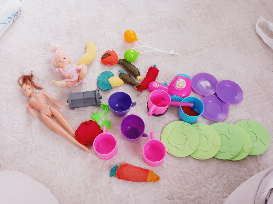 Renkli plastik oyuncak mutfak seti, bardaklar, tabaklar, tencereler ve kumaş sebzeler içerir. Hayal gücünü destekler. ️