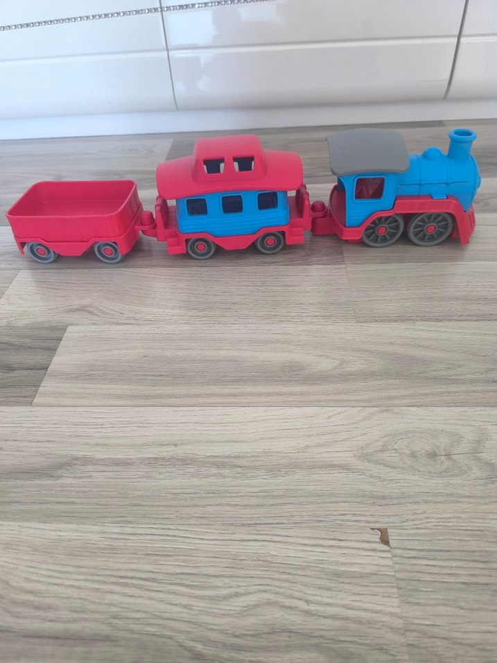 Kırmızı ve mavi renklerde, dayanıklı plastikten yapılmış oyuncak tren seti, iki bağlı vagon içerir. hiç kullanilmamiş gibi