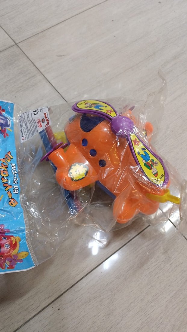 Canlı detaylara sahip renkli turuncu plastik oyuncak uçak, şeffaf ambalajda. ✈️