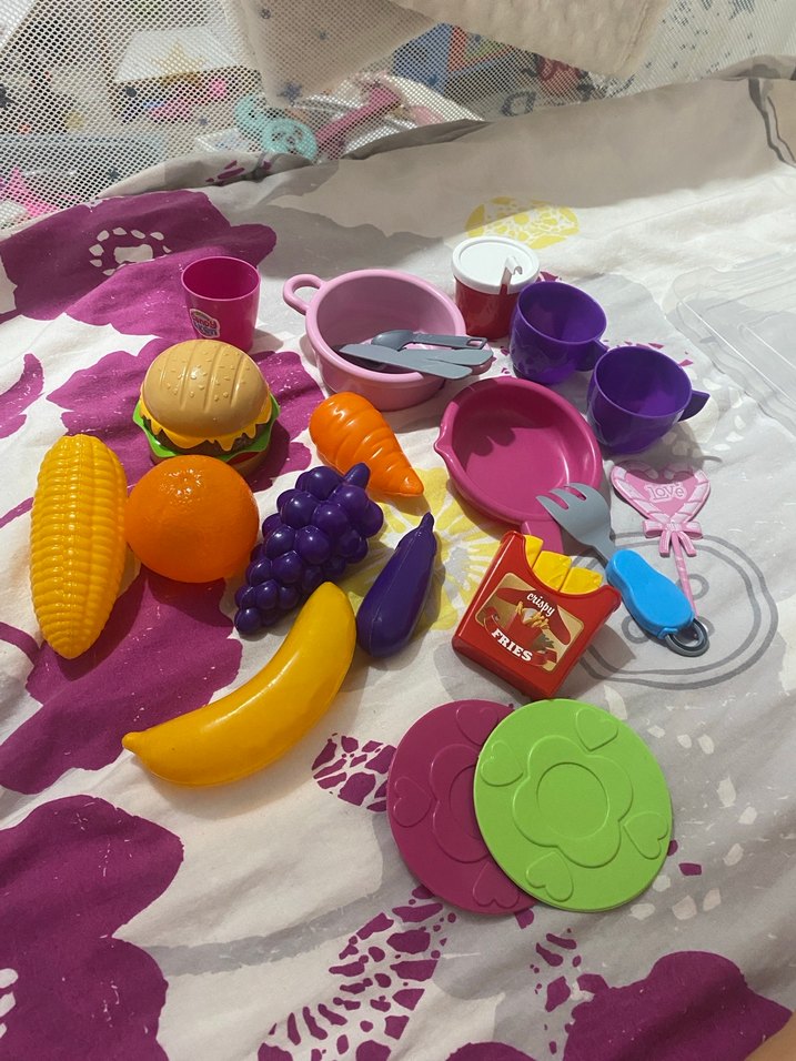 Çeşitli meyve, sebze, mutfak eşyaları ve tabaklar içeren renkli plastik oyuncak yemek seti. Fazla olduğu için satıyorum 20 parçadır ama 5 parça daha eklicem