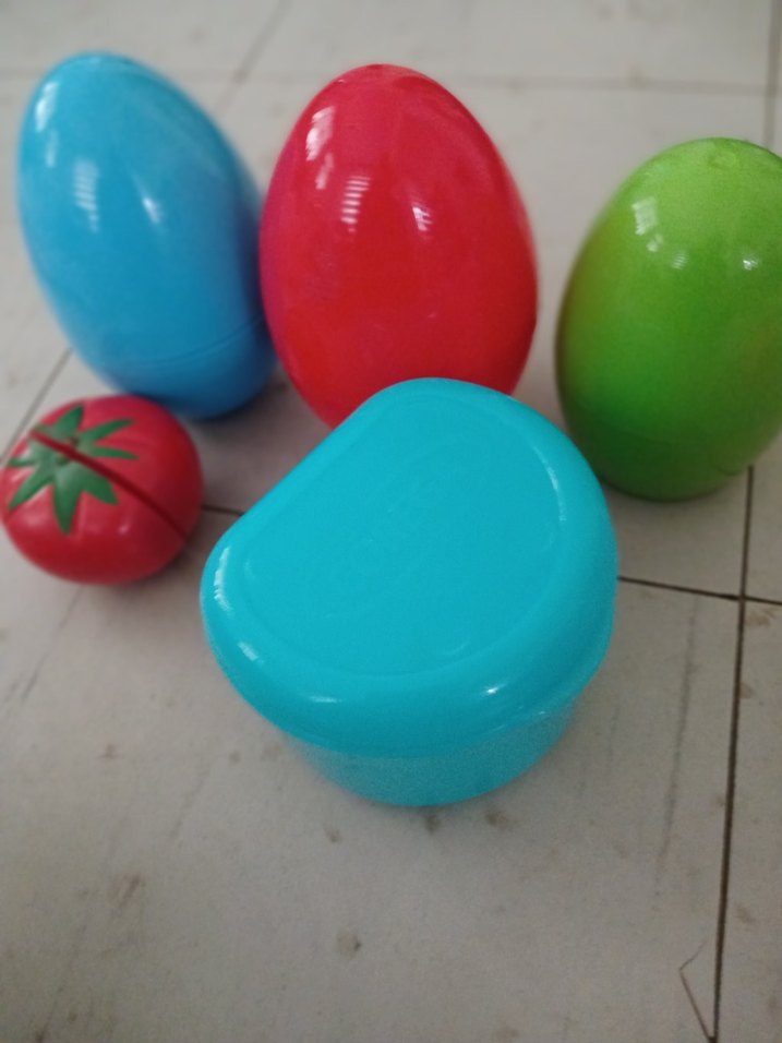 Renkli plastikten yapılmış yumurta ve domates şekilli oyuncak seti.
