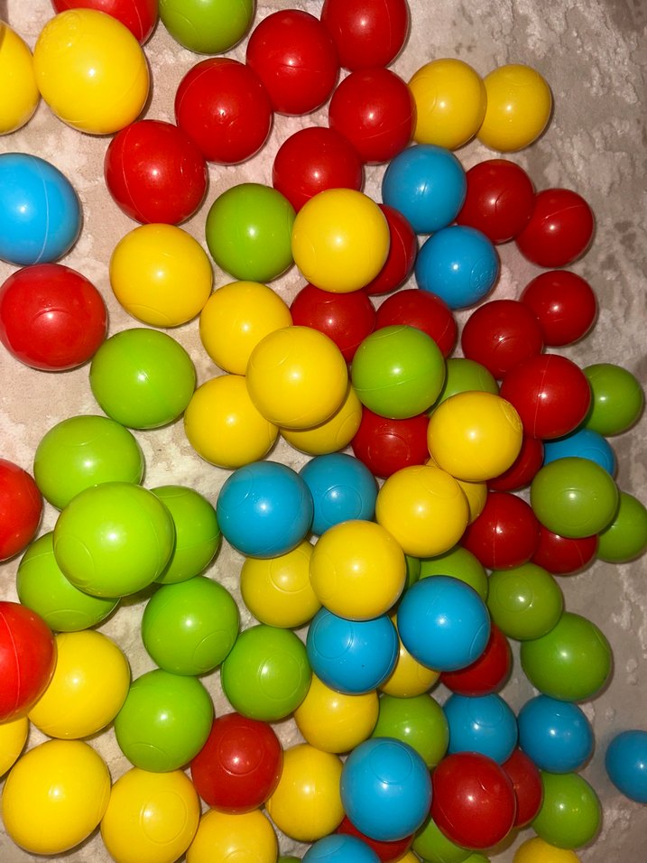 Kırmızı, sarı, yeşil ve mavi renklerde çok sayıda renkli plastik toplar. Canlı ve parlak renklere sahip. 103 adet