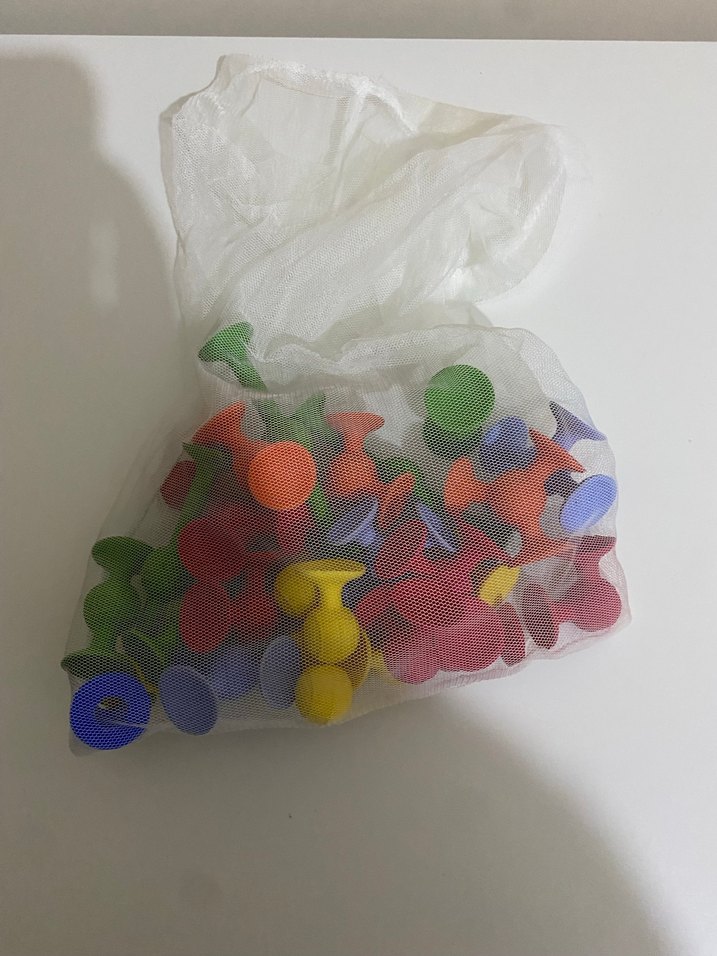 Beyaz file torbada çok renkli plastik emici toplar bulunur. Yeşil, kırmızı, sarı, mavi ve turuncu renkler mevcuttur.