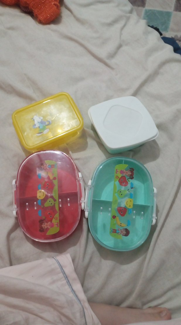 Renkli plastik yemek saklama kapları, güvenli kapaklı ve eğlenceli çizgi film desenli. Atıştırmalık ve yemek saklamak için uygundur.