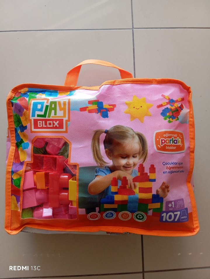 Renkli Play Blox setinde 107 parlak blok bulunur. Kolay saklama için taşıma çantasıyla birlikte gelir.