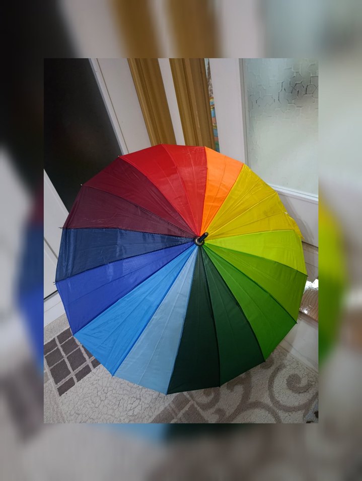 Kadın şemsiyesi, pliseli tasarıma ve canlı çok renkli panellere sahiptir, sokak stili için uygundur.