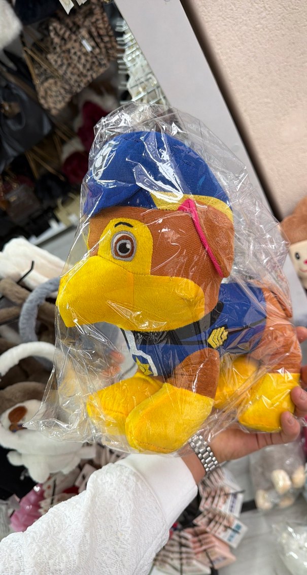 Yumuşak kumaştan yapılmış, mavi polis kostümü giymiş renkli peluş oyuncak köpek.