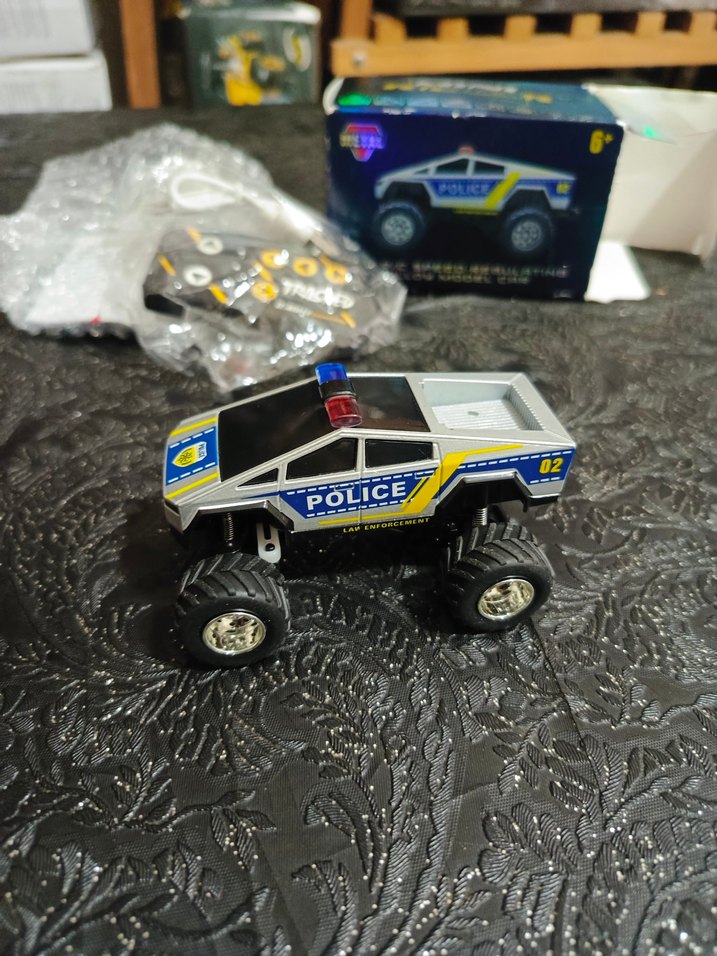 bluetooth + kumandalı Üzerinde 'POLICE' yazısı bulunan, büyük tekerlekli renkli polis temalı oyuncak araba.