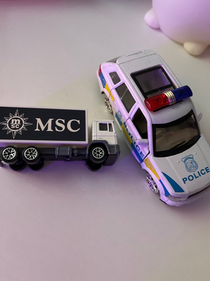 Işıklı beyaz polis arabası ve MSC markalı renkli oyuncak kamyon içerir. Hayal gücünü destekler.