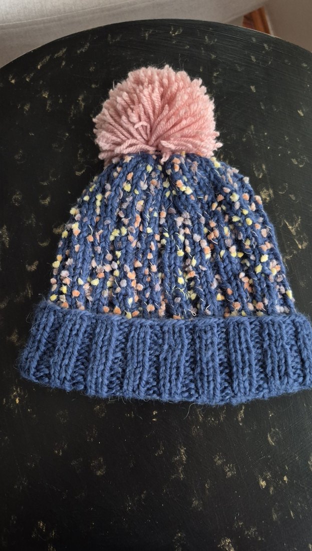 Yumuşak pembe ponponlu, renkli dokulu örgüden yapılmış rahat bir kadın bere, bohem tarzına uygundur.