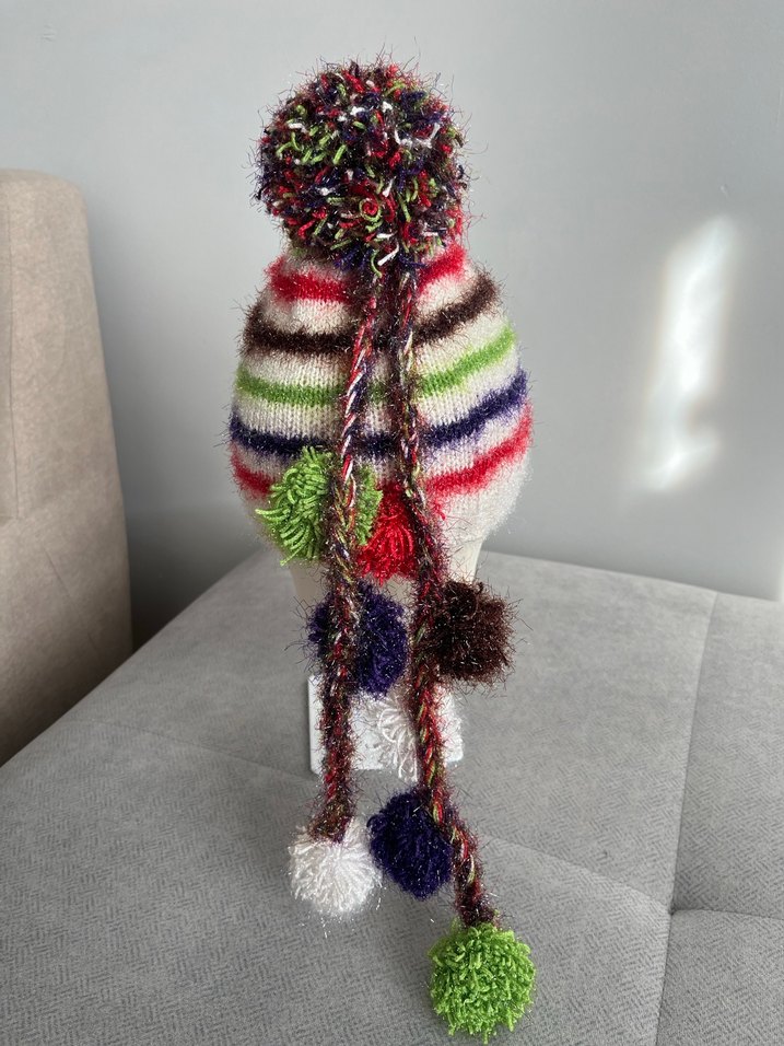 Çok renkli çizgili ve ponponlu örgü bere, rahat ve bohem bir tarz sunar. Canlı ve retro esintili aksesuarlar sevenler için ideal.