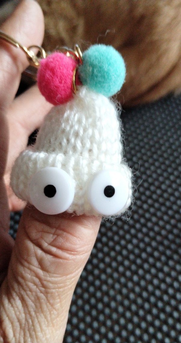 Beyaz örgü tabanlı, pembe ve turkuaz renkli ponponlarla süslenmiş, büyük beyaz düğme gözlere sahip anahtarlık.