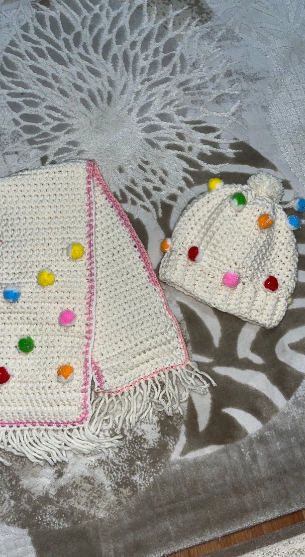 Renkli ponponlar ve püsküllerle süslenmiş, örgü dokulu çocuk bere ve atkı seti, bohem tarzı için uygundur.