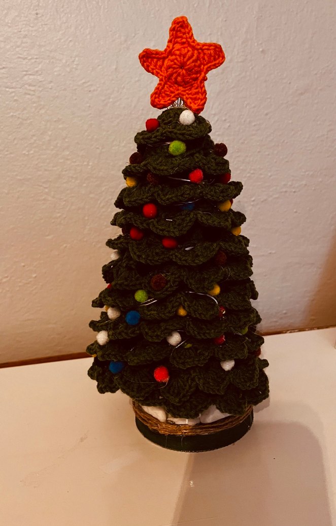 Renkli ponponlarla süslenmiş koyu yeşil örgü yılbaşı ağacı, turuncu yıldızla taçlandırılmış, yuvarlak taban üzerinde duruyor.