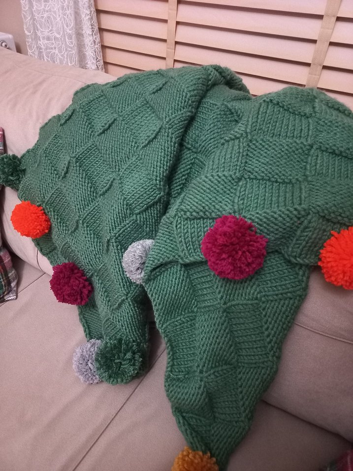 Yeşil örgü dizbattaniyesi, renkli ponpon işlemeleriyle süslenmiş. Yumuşak ve konforlu bir yapıya sahip.