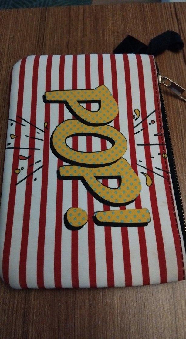 Renkli, kırmızı beyaz çizgili desenli ve fermuarlı, sentetik kumaştan yapılmış pop kültür baskılı kadın portföyü. Retro ve bohem tarzlar için uygundur.