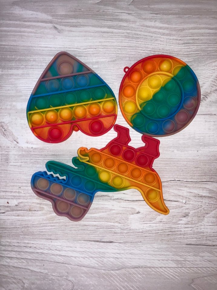 Farklı şekillerde, renkli Pop It eğitim oyuncakları seti. Yumuşak, sıkılabilir malzemeden yapılmış, canlı gökkuşağı renklerine sahip.