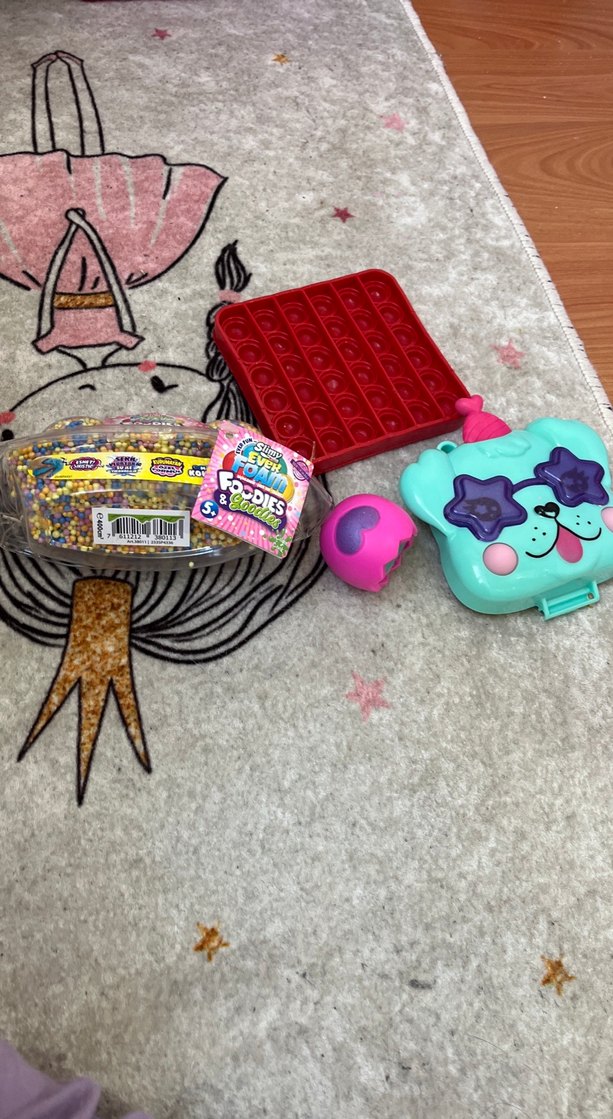 Kırmızı pop-it, yıldız gözlü köpek şeklinde kutu, pembe-mor küçük oyuncak ve renkli boncuklar içeren oyuncak seti.