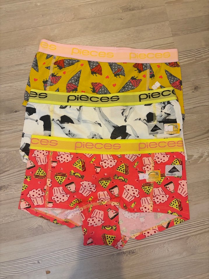 Renkli pop kültür baskılı, kısa paçalı kadın mini iç çamaşırları, athleisure tarzında tasarlanmıştır. Birden fazla canlı desen içerir.