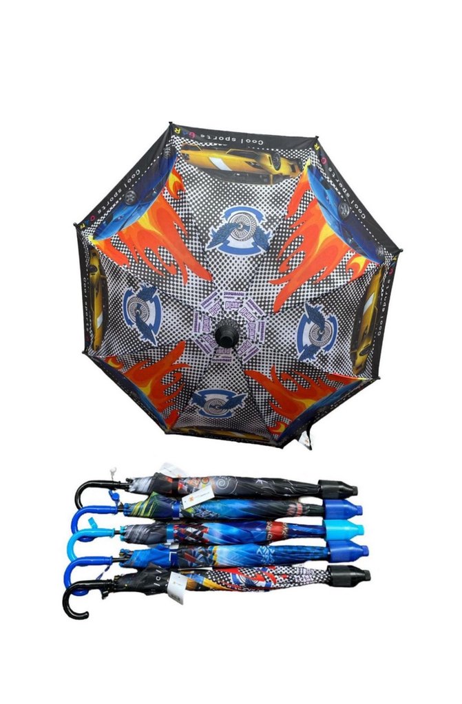 Renkli, pop kültür desenli erkek çocuk şemsiyesi, rock punk havası ve fermuarlı kapanışıyla sokak stiline uygundur. ☂️