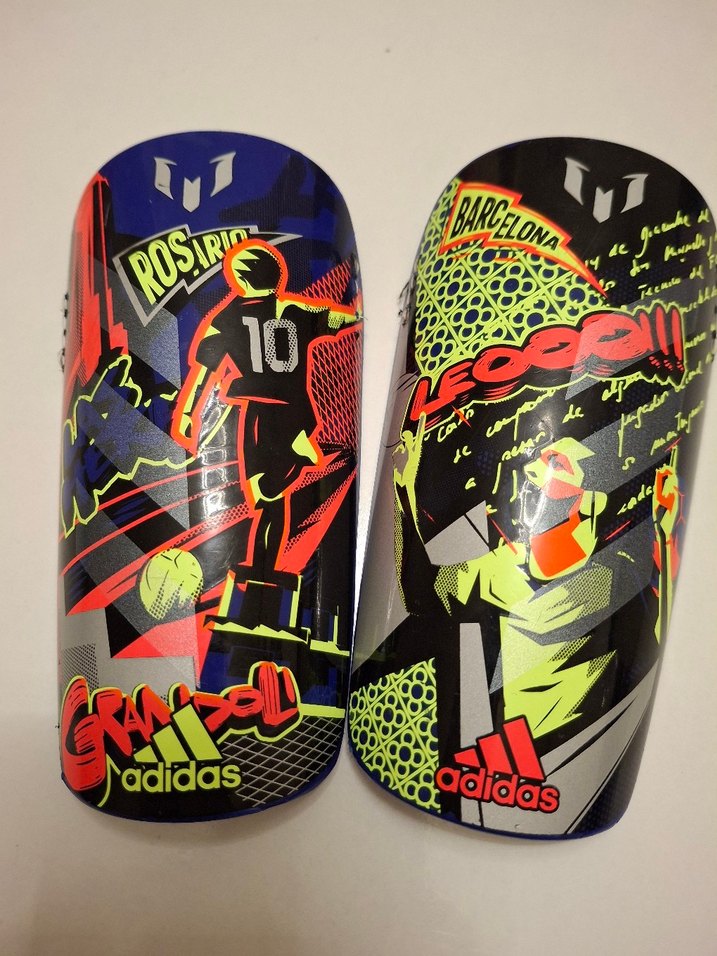 Renkli, pop kültür desenli motosiklet dizlikleri, velcro bantlarla sabitlenir. Plastik malzemeden üretilmiş, avant-garde tarzında adidas logolu.