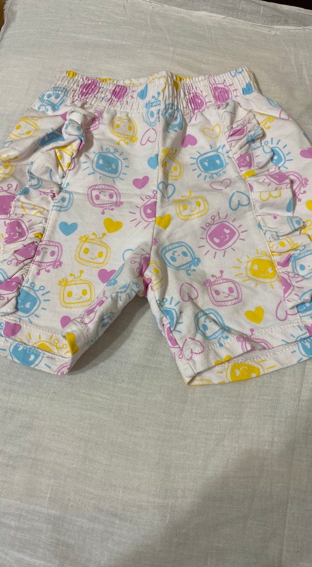 Bol kesim, renkli pop kültür desenli kız şortu, yanlarda fırfır detaylı ve yumuşak sentetik kumaştan yapılmıştır.