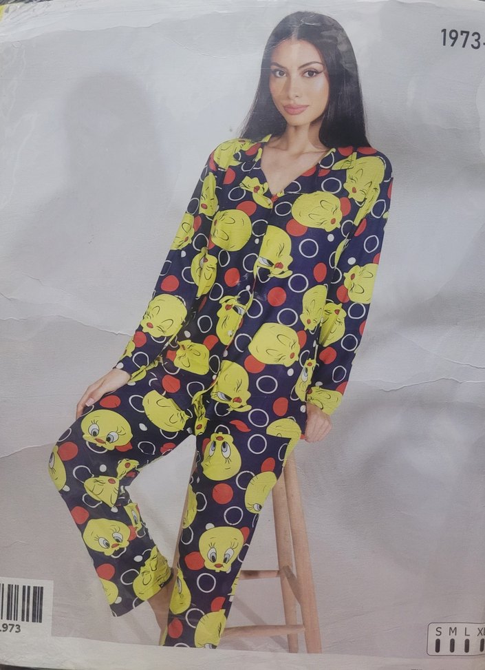 Rahat kesim, uzun kollu kadın pijama takımı, renkli pop kültür desenleri ve canlı bağlama boyası görünümü ile rahat ve konforlu.