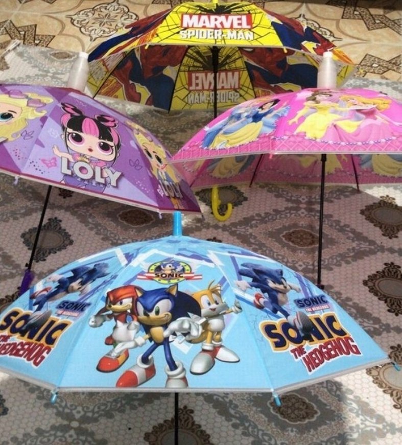 Parlak yüzeyli, Marvel Spider-Man, LOLY ve Sonic the Hedgehog gibi pop kültür desenlerine sahip renkli kadın şemsiyeleri. Sokak stiline uygun rock punk havası verir.