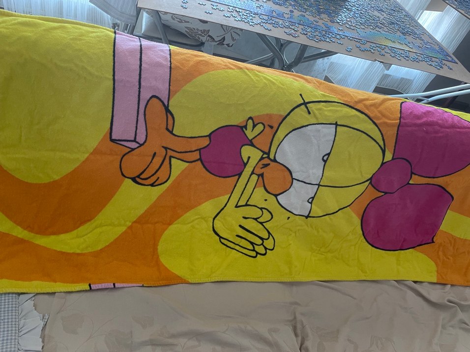 Sarı renkte, renkli pop kültür baskılı plaj havlusu. Yumuşak ve emici kumaştan üretilmiştir. ️